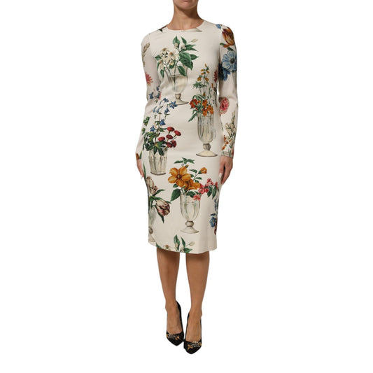 Dolce & Gabbana White Flower Vase Silk Sheath Midi Dress